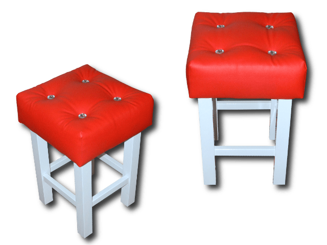 Taboret klasyczny – tapicerowany ekoskórą w kolorze czerwonym (kolor nr. 12), głęboko nabijany ozdobnymi kryształkami o średnicy ok. 25mm, kolor: biały połysk. Wysokość: 50cm, siedzisko: 34cm/34cm.