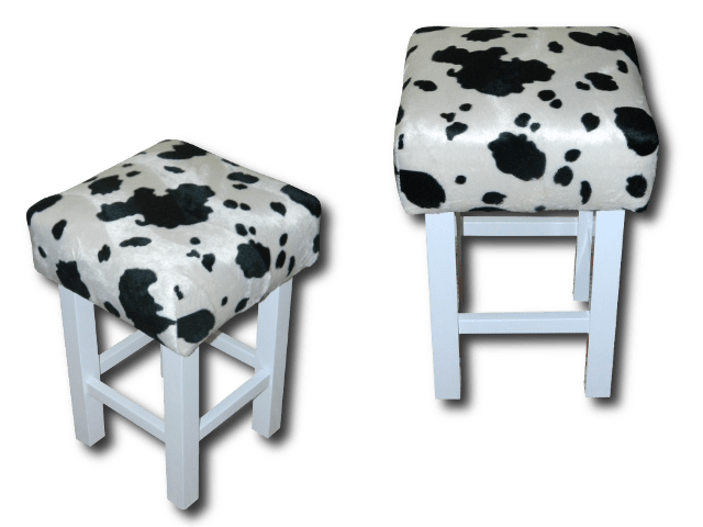Taboret klasyczny – tapicerowany motywem animals, wzór: krowa, kolor: biały połysk. Wysokość: 50cm, siedzisko: 34cm/34cm.