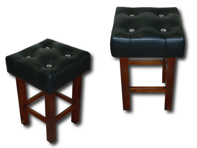Taboret klasyczny – tapicerowany ekoskórą w kolorze czarnym (kolor nr. 32), głęboko nabijany guzikami w kolorze materiału, przeszywany, kolor: palisander(lakierobejca). Wysokość: 50cm, siedzisko: 34cm/34cm.